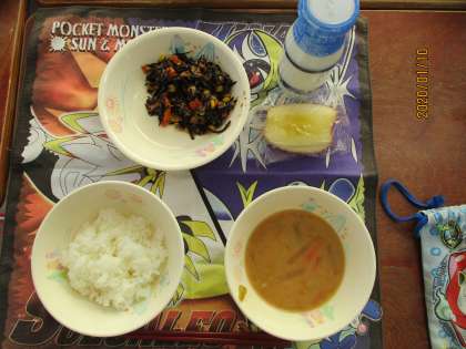 【献立】 ごはん 牛乳 ごじる ひじきのいために りんご