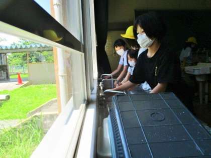5年生。 理科室で手洗い。