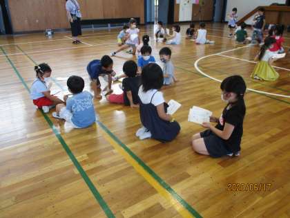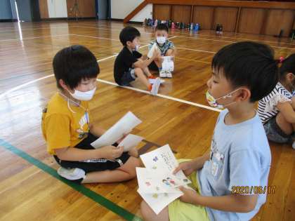 きょうは、たいいくかんで 1ねんせい みんなで めいしこうかんを しました。1くみさんは 2くみさんに、2くみさんは 1くみさんに めいしを わたして、じこしょうかいを しました。「ぼくは げーむが すきです。」「どんな げーむを するの?」と はじめて おはなしした おともだちと、じょうずに じこしょうかいが できました。