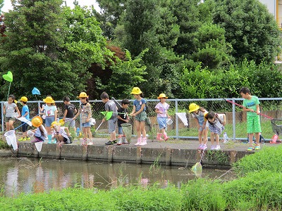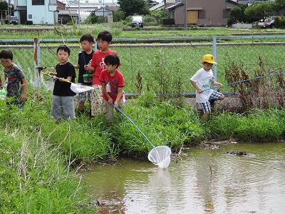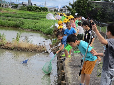 子どもたちは、お家から持ってきたたもを使って、生き物を見つけようと頑張っていました。保護者の皆様、服や長靴、たもや虫かごなどご準備いただき、ありがとうございました。