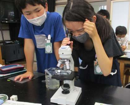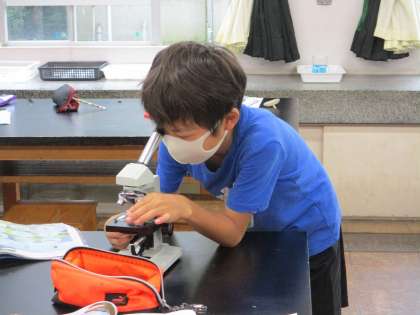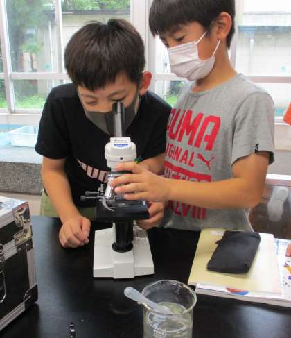中庭のトンボ池の水を顕微鏡で観察します。