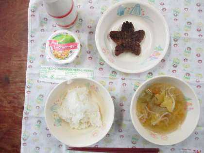 【献立】 ごはん 牛乳 たなばた汁 てりやきハンバーグ シークヮーサーゼリー