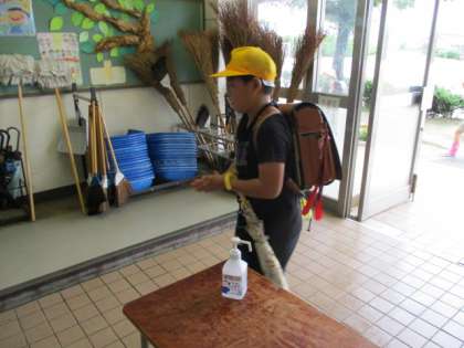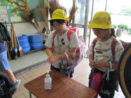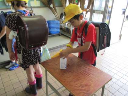 4年生の靴箱の前で。