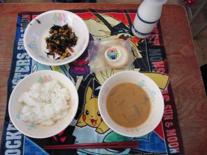 【今日の献立】 ご飯 牛乳 豆乳入り味噌汁 ひじきの炒め煮 お米のタルト