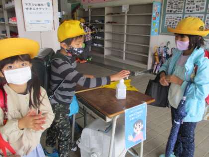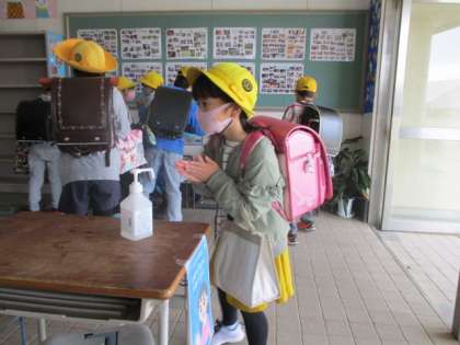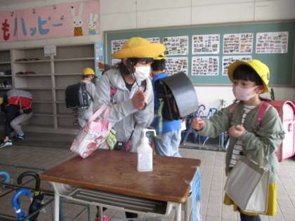 消毒して校舎内に。
