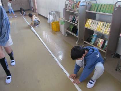 廊下の右側通行の掲示を貼り換えたり、