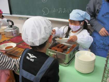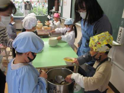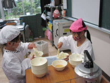 協力して給食を配ります。