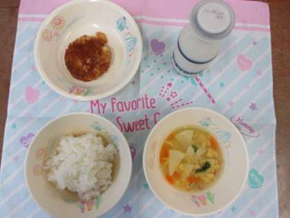 【献立】 ごはん 牛乳 ちゃわんむしスープ ミンチカツ