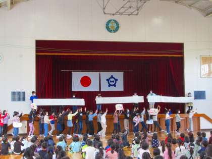 6年生の行動や声を見本にして、全校であいさつをしました。