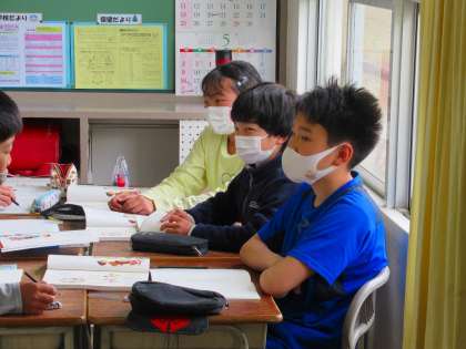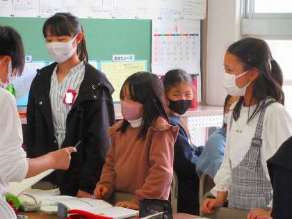グループに分かれて、最初と最後の文を決めて、お話を作ります。