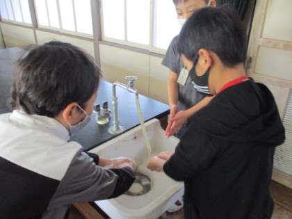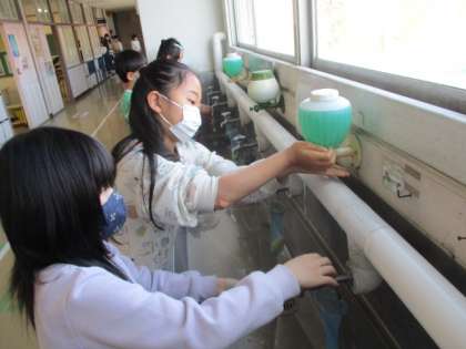 音楽が流れて、全校一斉に手洗いです。