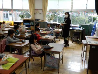 一番最初の「どうとく」の授業の内容は「がっこう だいすき」です。「そとあそび」や「きゅうしょく」など、今の学校生活で楽しいことを元気よく発表してくれました。