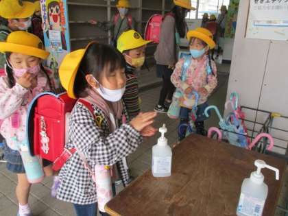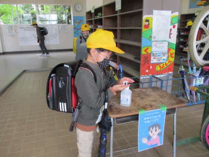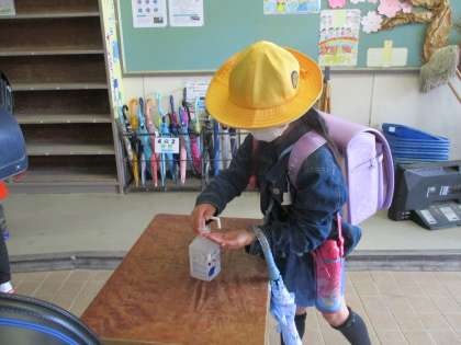 今朝は、ぱらぱらと雨が降り出し、昇降口では傘をたたむ姿がたくさん見られました。。傘をたたんだ児童から、手指の消毒をしています。