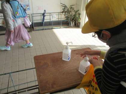 いつものように昇降口で手指消毒をします。