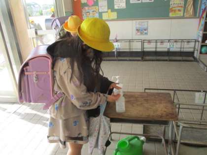 感染経路を経つことを目的に教室に入る前に手指消毒をします。