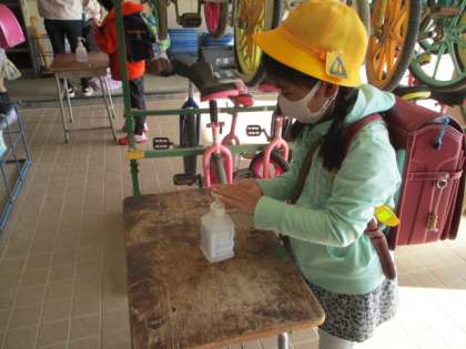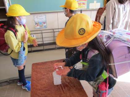 教室に入る前に手指の消毒をします。