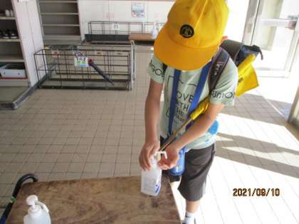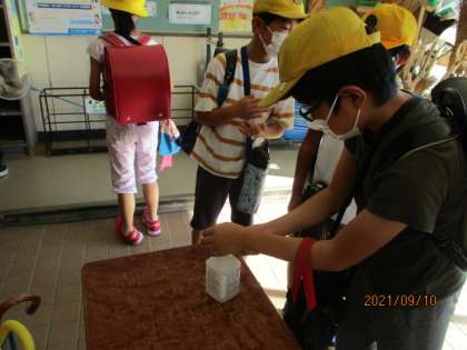 登校したら、昇降口で手指の消毒をします。