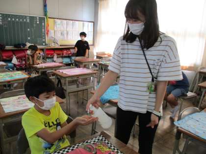給食前の手洗いを済ませた児童たちは 消毒をしてもらいます。 清潔な環境で、給食をいただきます。