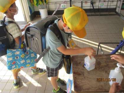 昇降口で手指の消毒をします。