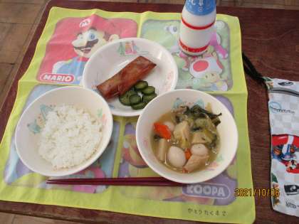 【献立】 ごはん ぎゅうにゅう はっぽうさい はるまき きゅうりのナルム