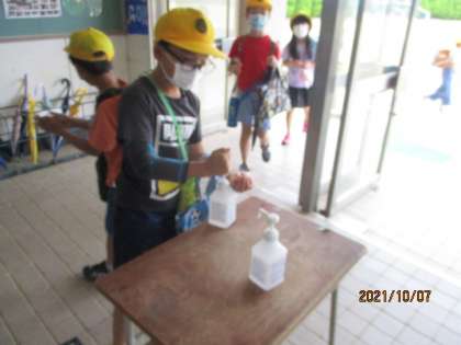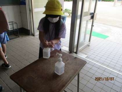 手指消毒をします。