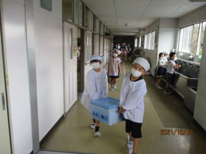 給食当番の人は協力して配膳をします。