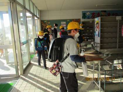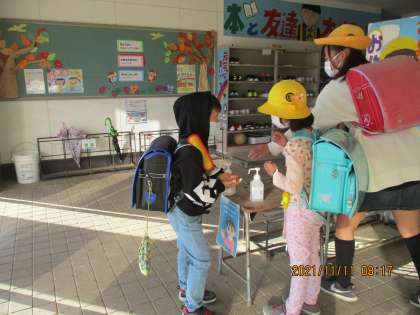 朝来たら、昇降口で手指消毒を行います。
