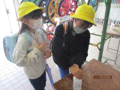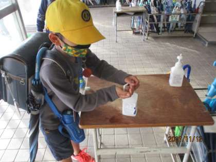 昇降口で手指の消毒をします。
