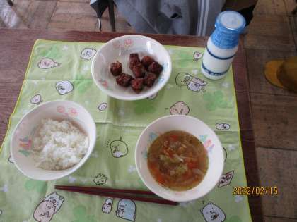 【献立】 ごはん ぎゅうにゅう はくさいとベーコンのスープ ぶたにくのカレーふうみからあげ
