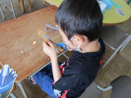 1年生の子は、おめん作りをしながらはさみの練習をしました。途中難しい箇所もありましたが、担任の先生に教えてもらいながら自力で切り取りに成功しました。