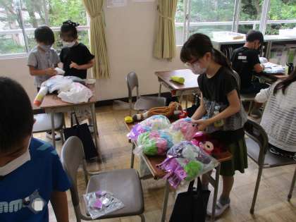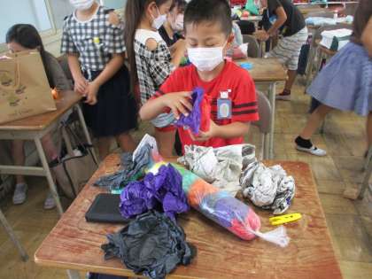 袋にきれいな紙の玉をつめて作ります。