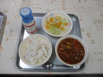 【献立】 むぎごはん ぎゅうにゅう ポークカレー あいちのメロンゼリーあえ