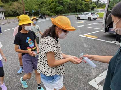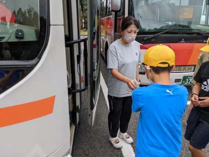 バスに乗る前に手指消毒をします。