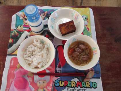 【献立】 むぎごはん ぎゅうにゅう ちゃんこじる きぬあつあげのあまみそがけ