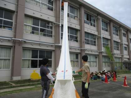 消防署の方からお話を聞いた後、消火器の使い方について学びました。