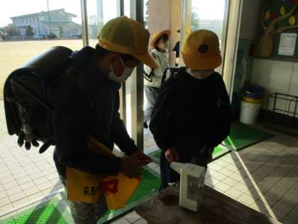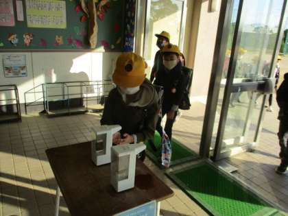 昇降口で手指消毒をします。