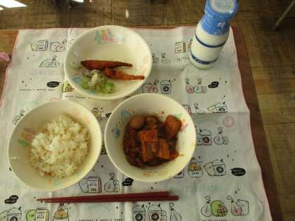 11・16(水)今日の給食 公開日 2022/11/16 更新日 2022/11/16 給食・食育 【献立】 きんめロウカットげんまいごはん ぎゅうにゅう みそおでん めひかりフライ キャベツのあかじそあえ
