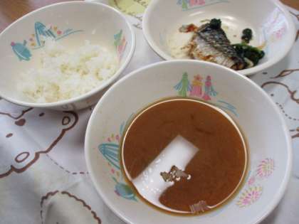 【献立】 ごはん 牛乳 さといものみそ汁 さばのこうみだれ こまつなのおひたし