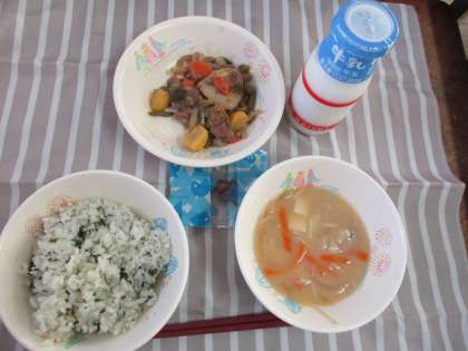 【献立】 わかめごはん 牛乳 いもに どんがらじる こくとうだいず
