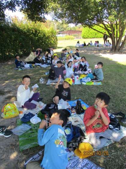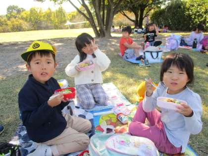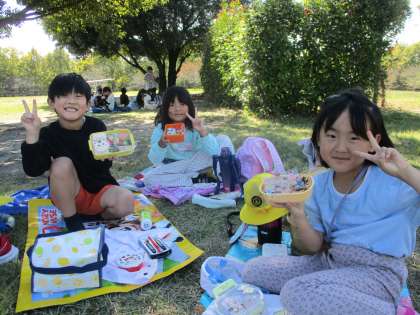 外に出て、友だちとお弁当をおいしく食べました。