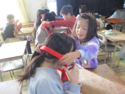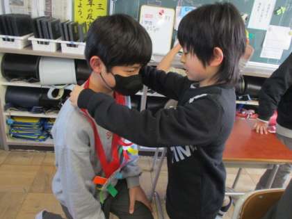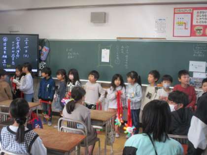 本日行われる6年生を送る会に先立って、1年生のペアの子が教室に来てくれて、プレゼントをもらいました。