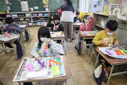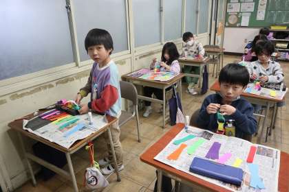 らいねんどのきょうしつづくりのために、わかざりをつくっています。