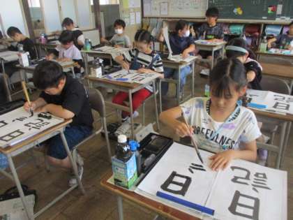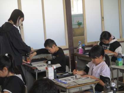 毛筆の学習をしています。先生から、筆づかいのこつを教えてもらっていました。