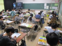図形の学習で、タブレット端末を使って三角形のしきつめをしています。楽しそうです。
