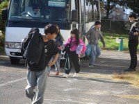 今日は、今年初めての水泳の授業です。バスに乗って出かけました。