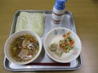今日の献立は、ご飯、牛乳、八宝菜、揚げギョーザ、バンサンスーでした。25日(火)...