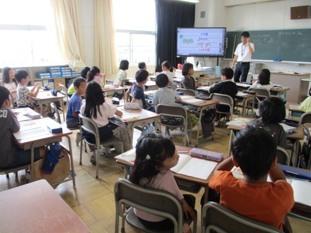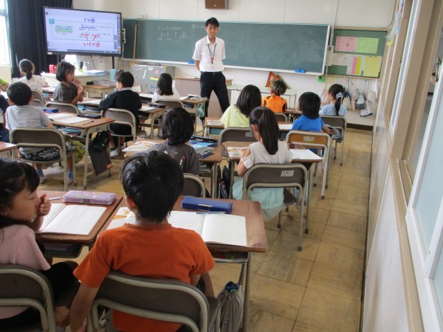 問題の中に、一つ分といくつ分はどこにかかれているかを探し、ペアで説明をし合っていました。