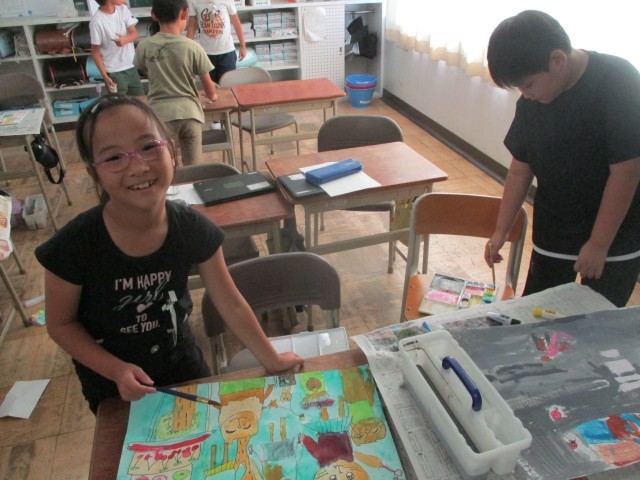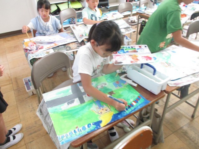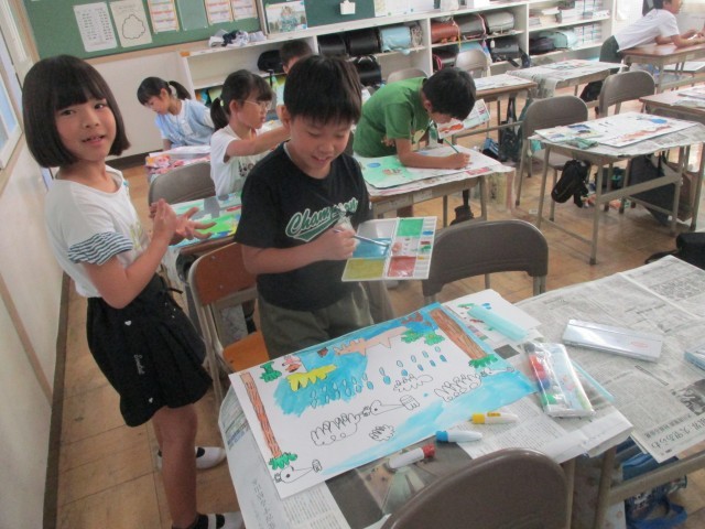 3年生は図工で読書感想画の色塗りをしています。筆の使い方や、色の濃淡に気をつけて描くことができています。