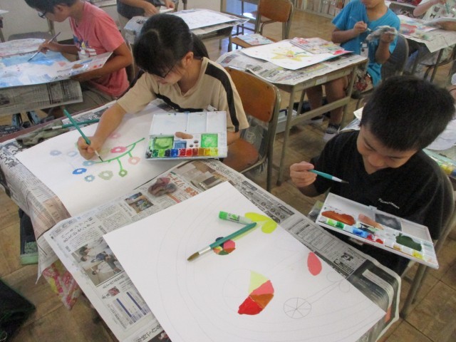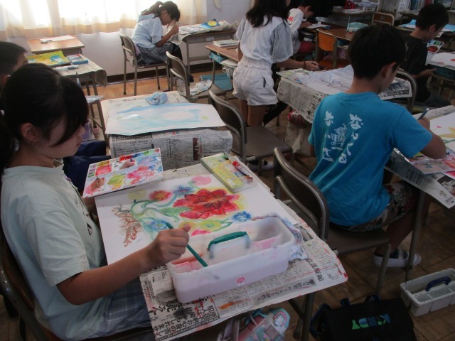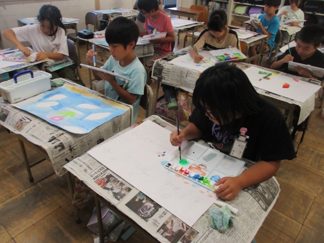 4年生の図工の授業の様子です。自分で考えた「まぼろしの花」を、色鮮やかに着色しました。