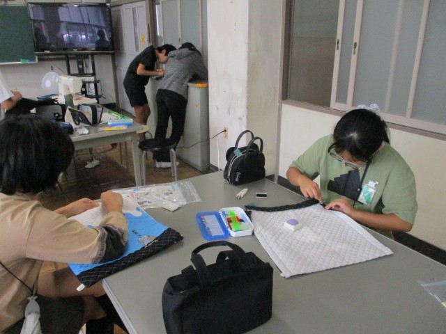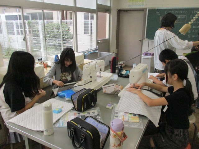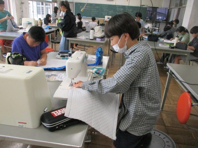 6年生の家庭科の授業の様子です。ナップサックのわきや出し入れ口を、ミシン縫いをしながら作成しています。